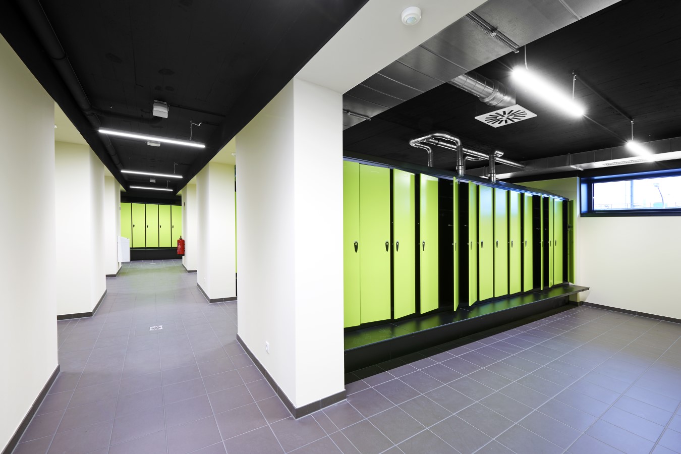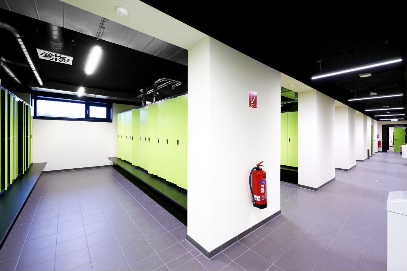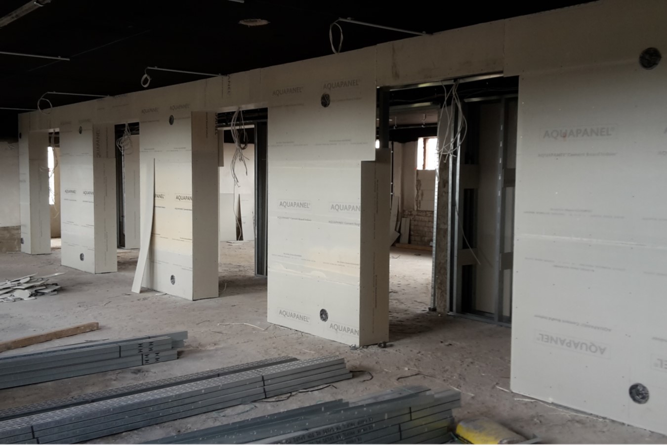 Um die Räume für die Mitarbeiter beziehungsweise Nutzer der Waschkauen genügend zu unterteilen, wurden zahlreiche Wände in die entkernte Gebäudehülle gesetzt und mit AQUAPANEL® Cement Board Indoor beplankt.