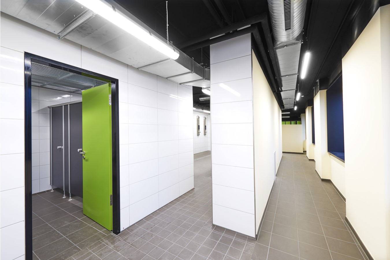 Wandkonstruktionen in den Spindräumen aus der wasserbeständigen und schimmelresistenten AQUAPANEL® Cement Board Indoor.