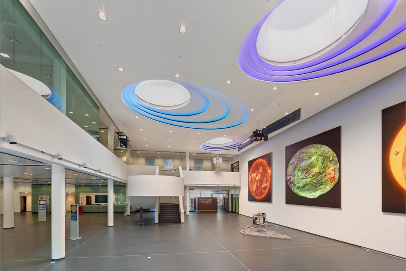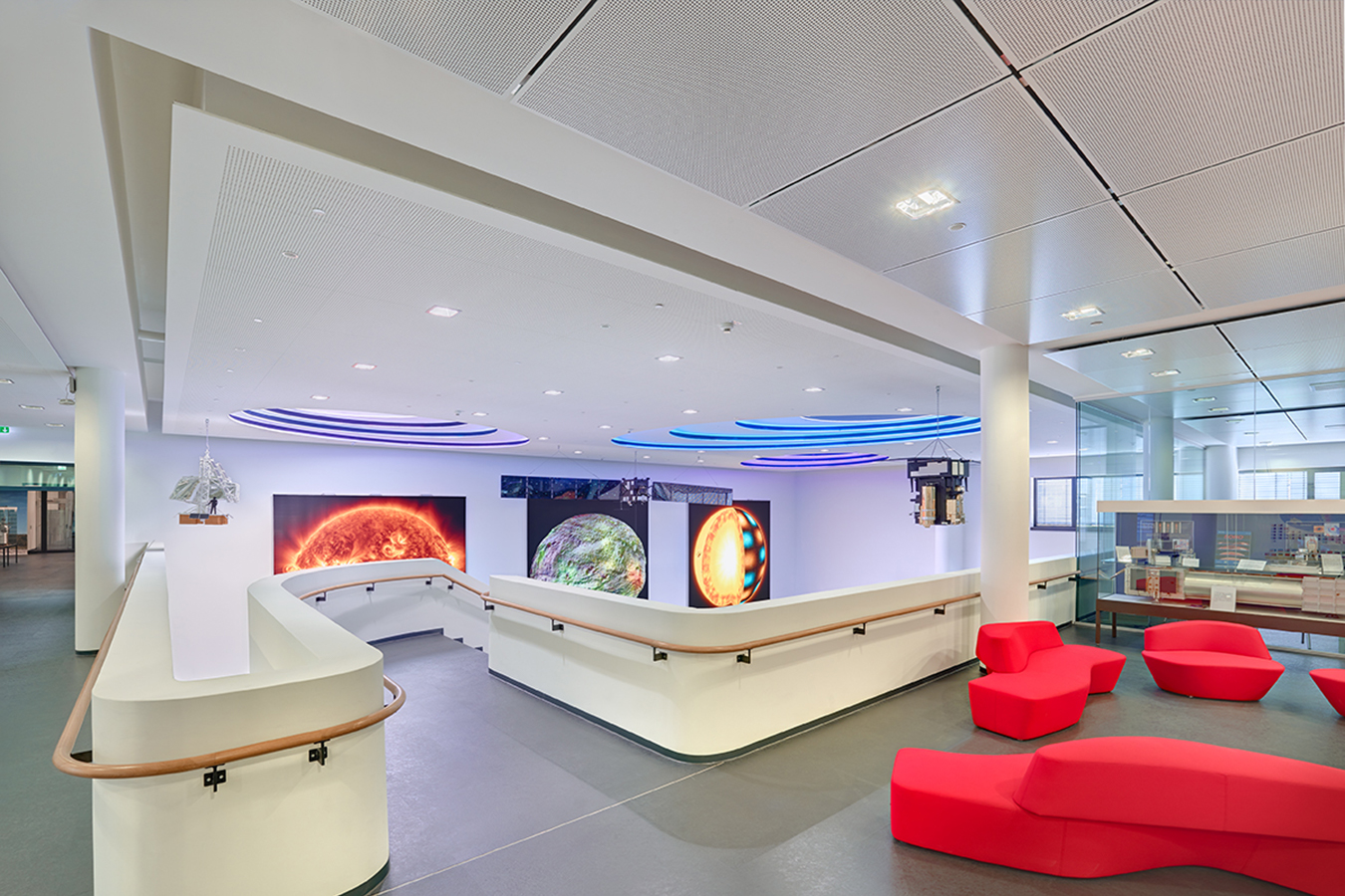 Der Neubau wurden nach Plänen von Carpus+Partner realisiert und gibt im zweigeschossigen Foyer die gestalterische Antwort der Architekten auf den Flug der Sonde.