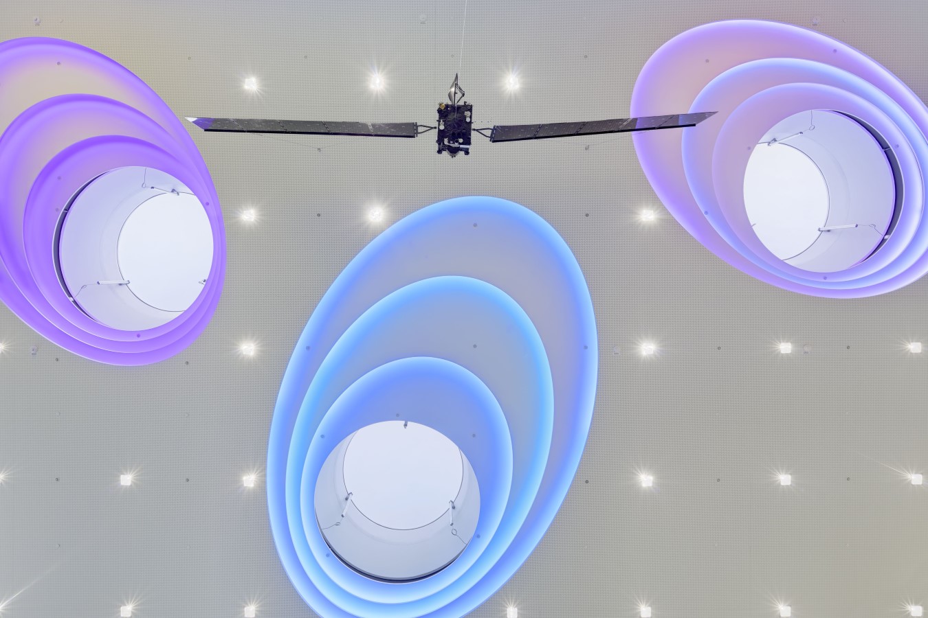 Die elliptischen Bahnen stellen den Flug der Raumsonde Rosetta zum Kometen Churyumov-Gerasimenko symbolisch dar. In der Decke sind drei große Felder mit unterschiedlichen Höhen eingeschnitten, die an die Planetenbahnen des Sonnensystems erinnern. Oberlichter im Zentrum der Konstruktion symbolisieren jeweils die Sonne.