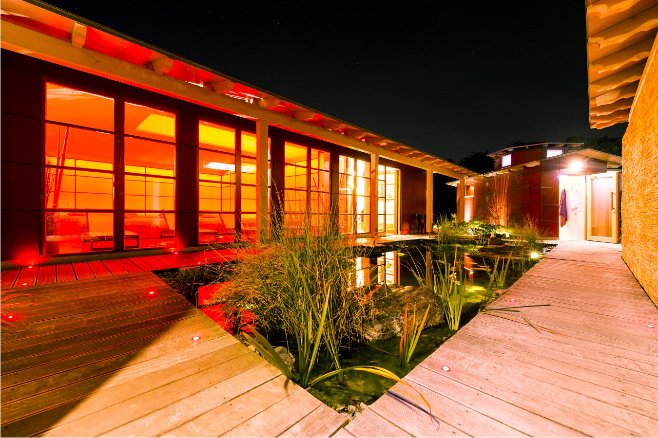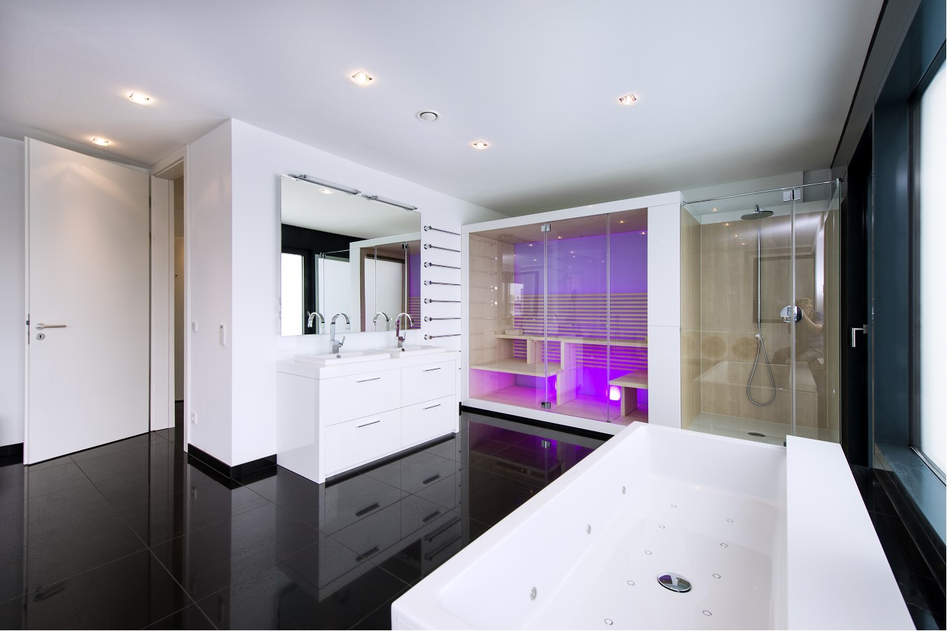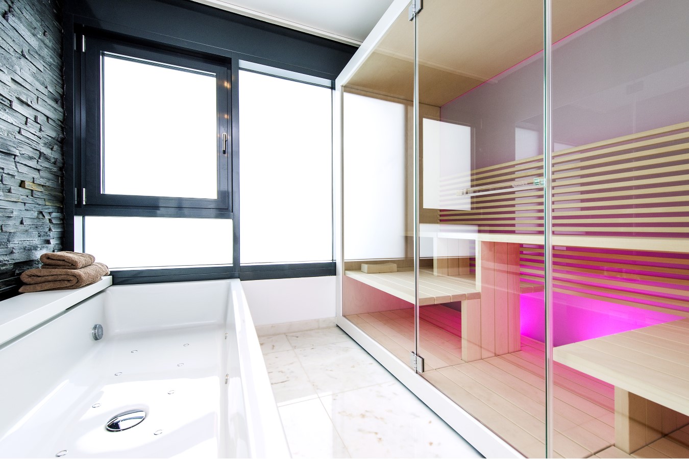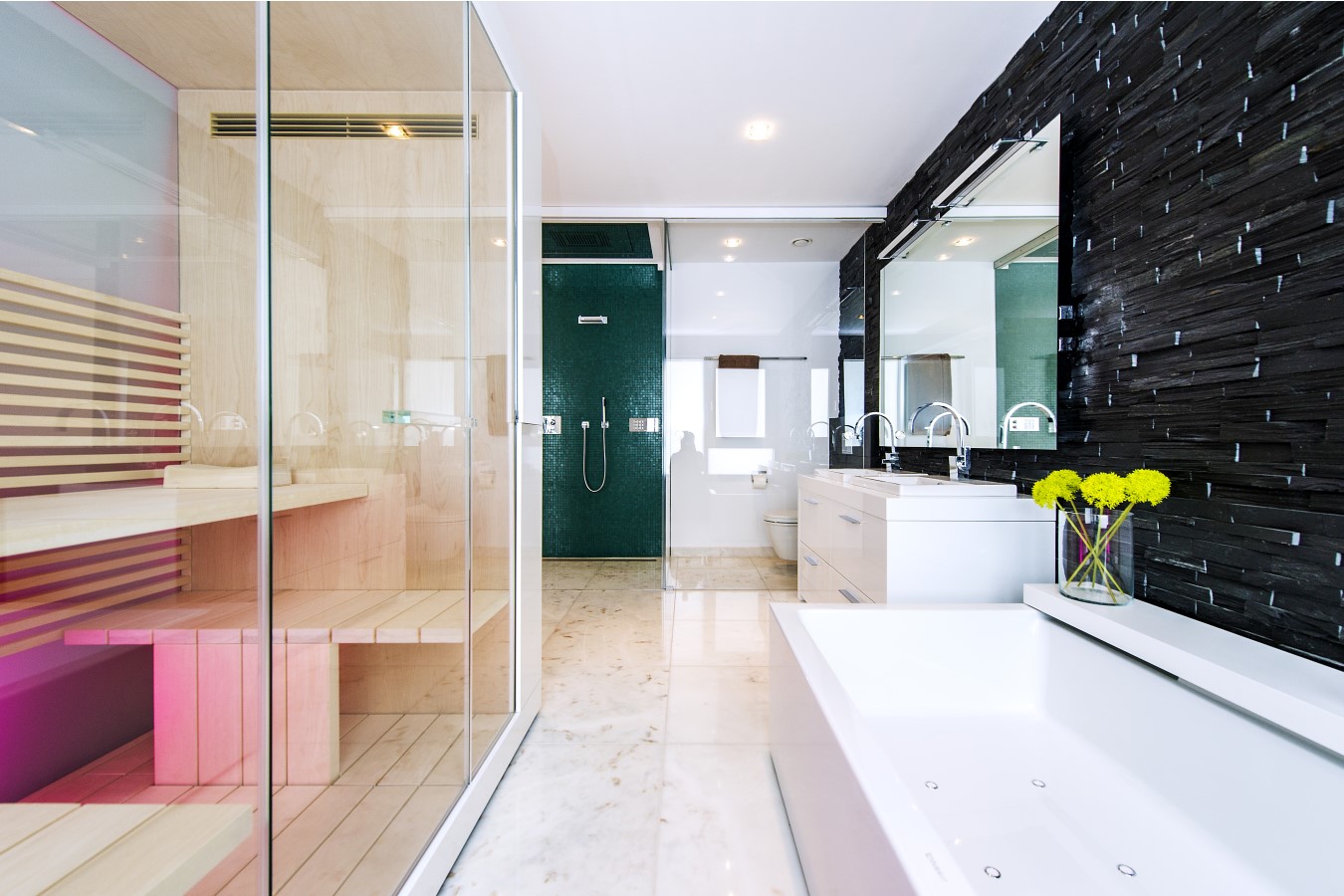 Auch die Sauna gehört zur Ausstattung: Kein Problem für die wasser- und feuchtigkeitsbeständigen Zementbauplatten, die mit einem pH-Wert von 12 auch widerstandsfähig gegen Schimmelpilzbefall sind.