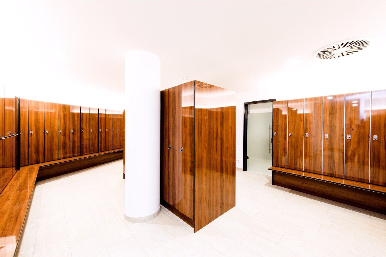 Auch in den Umkleiden kommen die positiven Eigenschaften der AQUAPANEL® Cement Board Indoor zum Tragen: Weder Luftfeuchtigkeit noch Wasser können den Wänden und Decken etwas anhaben.