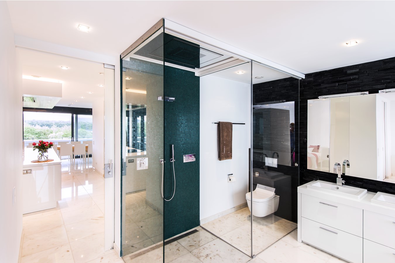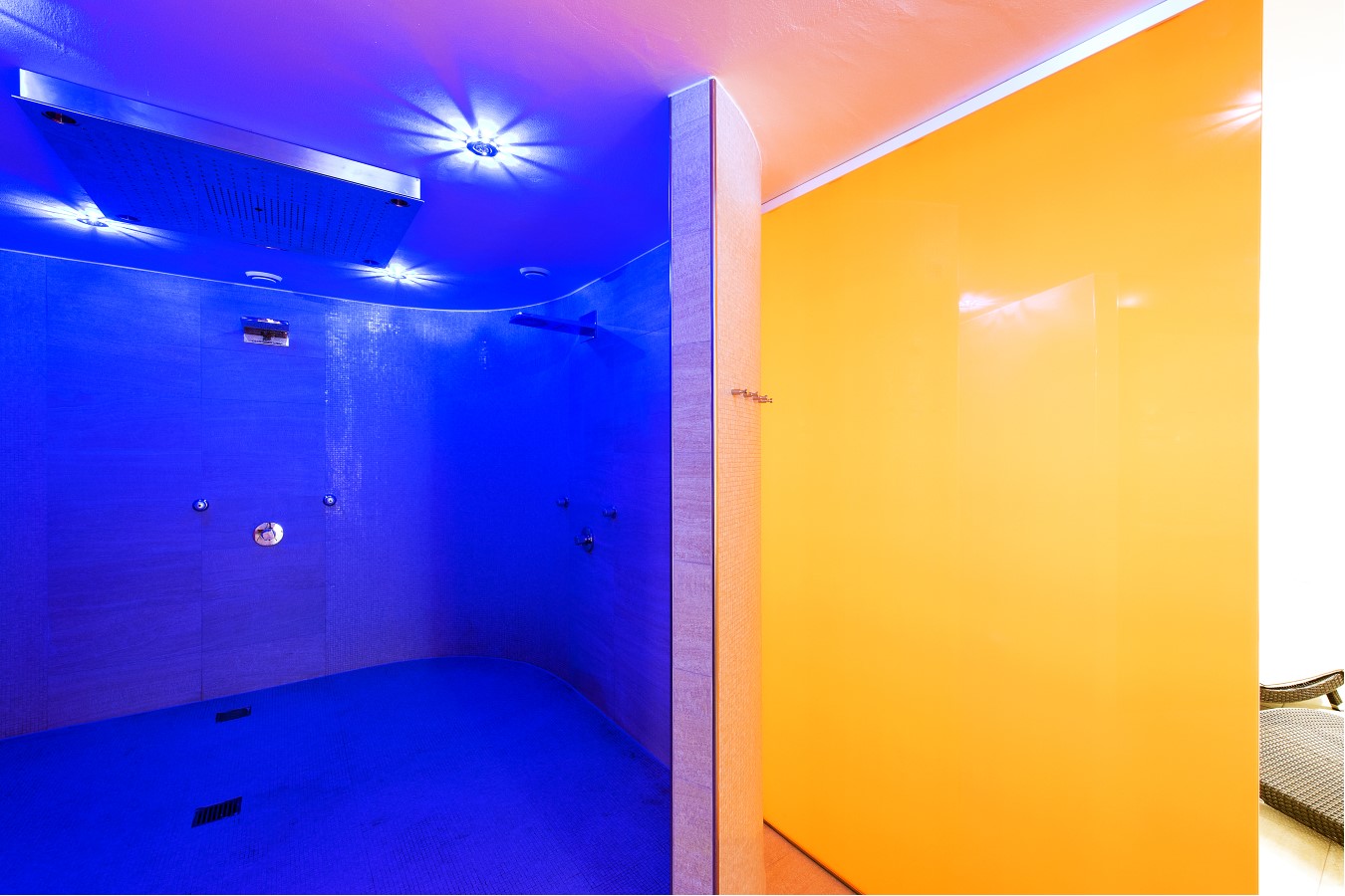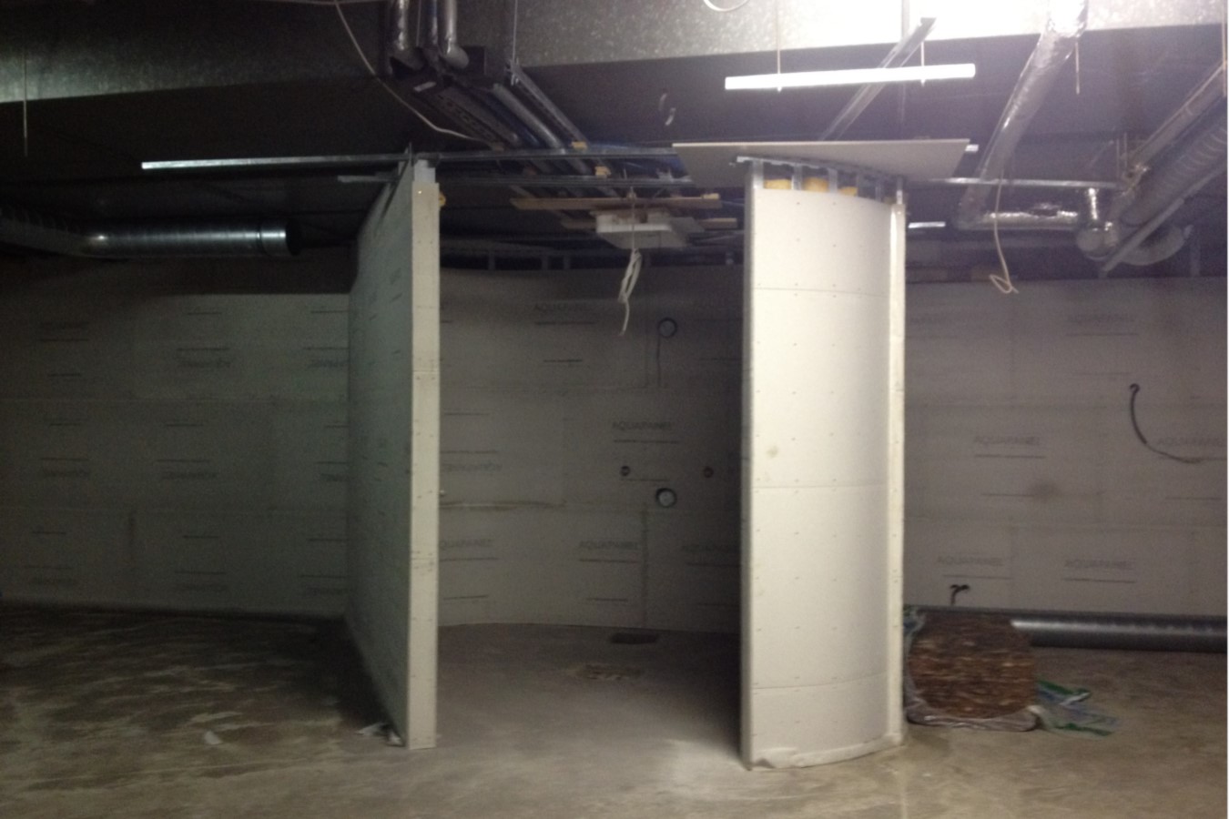 Die geschwungenen Wände der Erlebnisdusche im Member Spa aus AQUAPANEL® Cement Board Indoor nach der Fertigstellung.