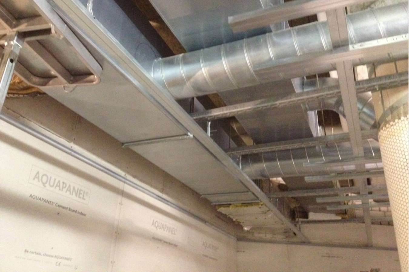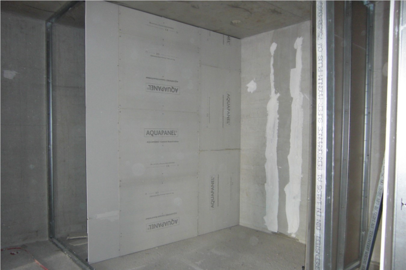 Wände und Decken der Nass- und Feuchträume wurden mit AQUAPANEL® Cement Board realisiert. In der abgehängten Decke konnten auch die Belüftungstechnik untergebracht werden.