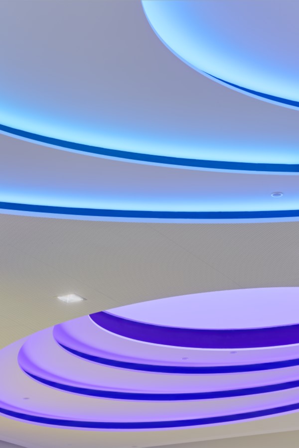 Da sich kein Punkt der eleganten Krümmungen mit üblichen Messzeugen ermitteln ließ, war das komplexe Deckendesign nur Dank präzise vorgefertigter Trockenbautechnik realisierbar.