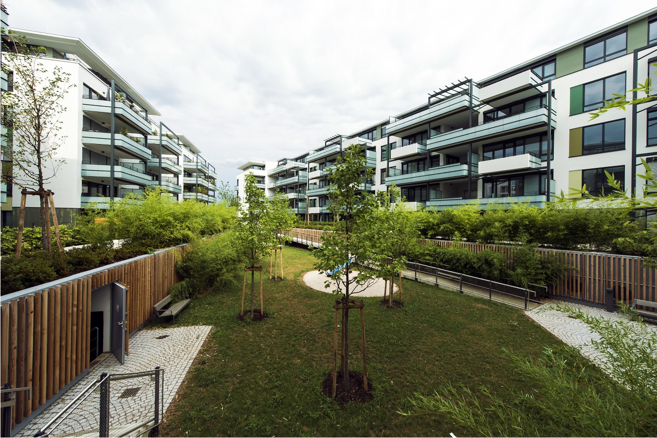 Attraktiver Wohnraum im Karlsruher City Park: das Wohnbauprojekt „Upper East“ umfasst 145 Eigentumswohnungen zwischen 57 m² und 162 m² Wohnfläche, die um einen grünen Innenhof gruppiert sind.