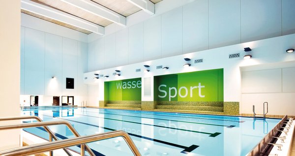 Entspannen unter schwebenden Wellen: elegante Deckengestaltung über dem 25 m Sport-Pool des „body + soul“ Fitness- und Wellness-Centers in München. Geplant von LSA Architekten GmbH, München und KerShine Interior Design, Berlin.