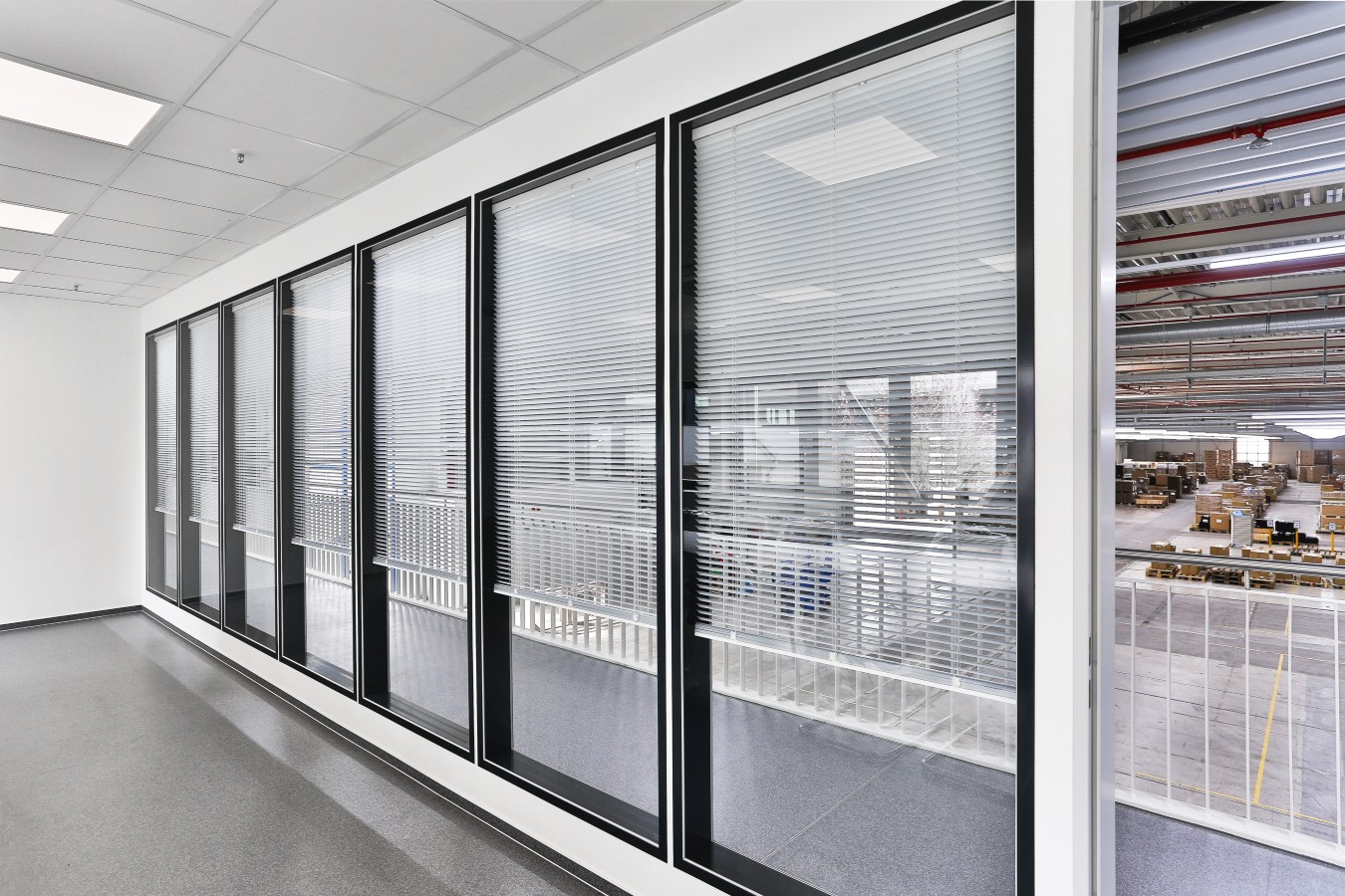 Für Diskretion im Konferenzraum sorgen Jalousien mit Horizontal-Lamellen, die in dieser Ausfertigung in den Zwischenraum der Fertigfenster eingebaut sind.