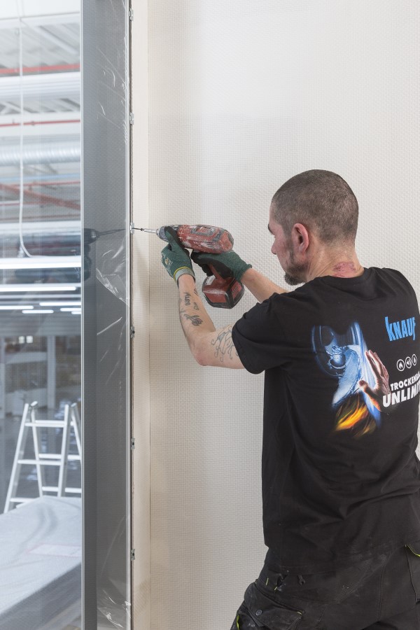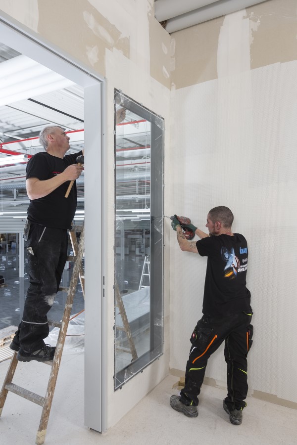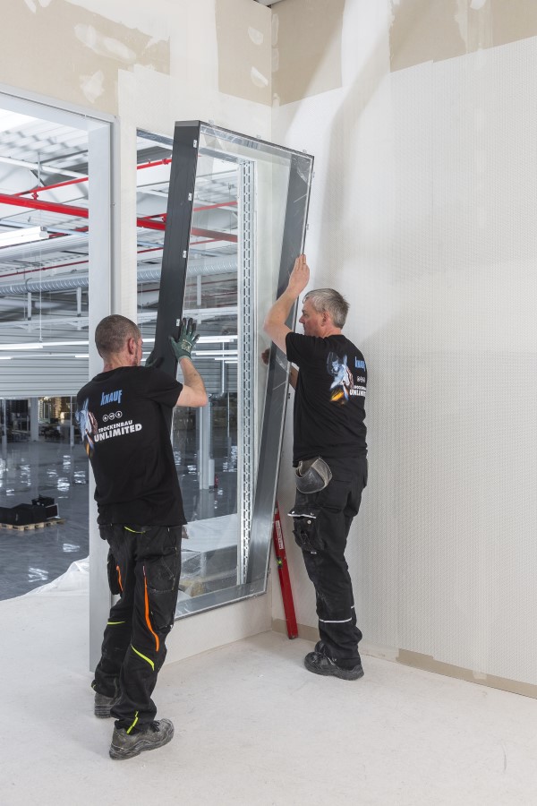 Zu zweit setzen die Trockenbauer die Fertigfenster samt Rahmen in die Knauf Gipskartonwände ein. Somit entfällt das Einsetzen des Glases vor Ort, also eine zusätzliche Gewerkeschnittstelle.