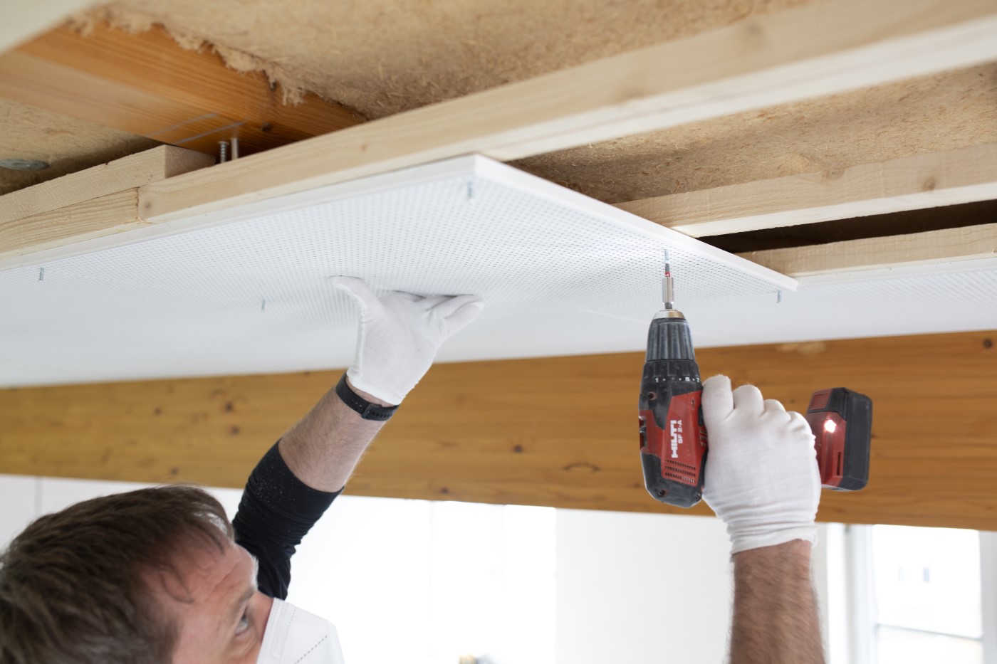 Sie ist die erste Lochgipsplatte, die nicht nur auf Metall-, sondern auch auf Holz-Unterkonstruktionen montiert werden kann. Die Akustik-Elemente werden ganz einfach direkt auf die CD-Profile oder die Holzlattung geschraubt – und fertig ist die Decke! Ohne Verspachteln, ohne Streichen.
