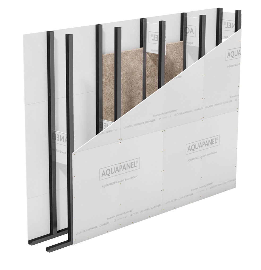 Das auf Abstand ausgebildete Doppelständerwerk kann beidseitig mit AQUAPANEL® Cement Board Indoor oder mit AQUAPANEL® Cement Board Indoor auf der einen Wandseite und einer Diamant auf der anderen Wandseite beplankt werden.