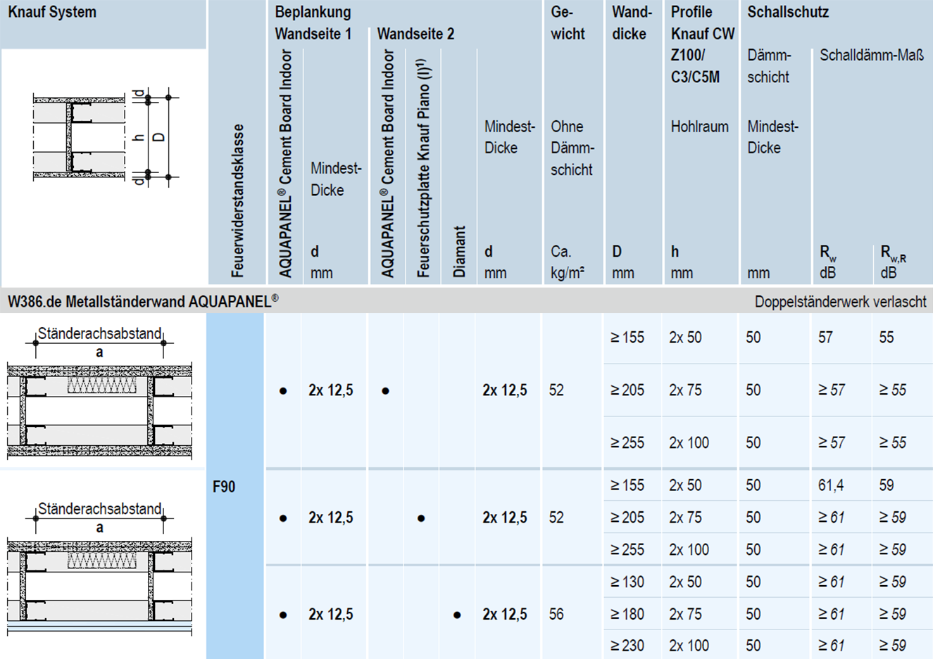 Das Ständerwerk beeinflusst das Wandsystem hinsichtlich Schallschutz und Höhe. Die W386 mit Mischbeplankung aus Indoor und Knauf Diamant (64 dB Schallschutz) erreicht zum Beispiel bis zu 8 Meter ohne Brandschutz. Mit Brandschutz sind 3 m Wandhöhe möglich.