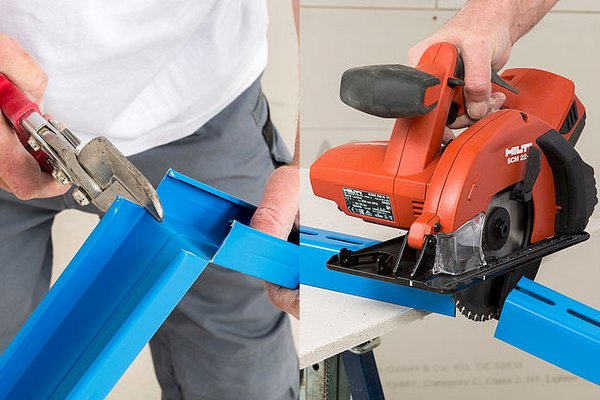 Korrosionsgeschützte CW Profile für Korrosionsschutzklassen C3 (schwarz) und C5M (blau) mit ≤ 1mm Materialdicke schneiden Sie einfach mit der Blechschere von Hand oder elektrisch. Beschichtete UW Profile ≥ 1 mm Dicke sollten Sie mit einer langsam laufenden Kreissäge schneiden.