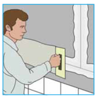AQUAPANEL® Q4 Finish mit einem 15 cm breiten Glätter aus Edelstahl auf die sichtbaren mit AQUAPANEL® Fugenkleber (PU) verklebten Fugen auftragen. Den Fugendeckstreifen (Glasfaser Fugendeckstreifen) fugenüberlappend in die Spachtelmasse drücken. Auf dem Fugendeckstreifen wird zusätzlich eine dünne Schicht AQUAPANEL® Q4 Finish aufgetragen. Überschüssiges Material entfernen.