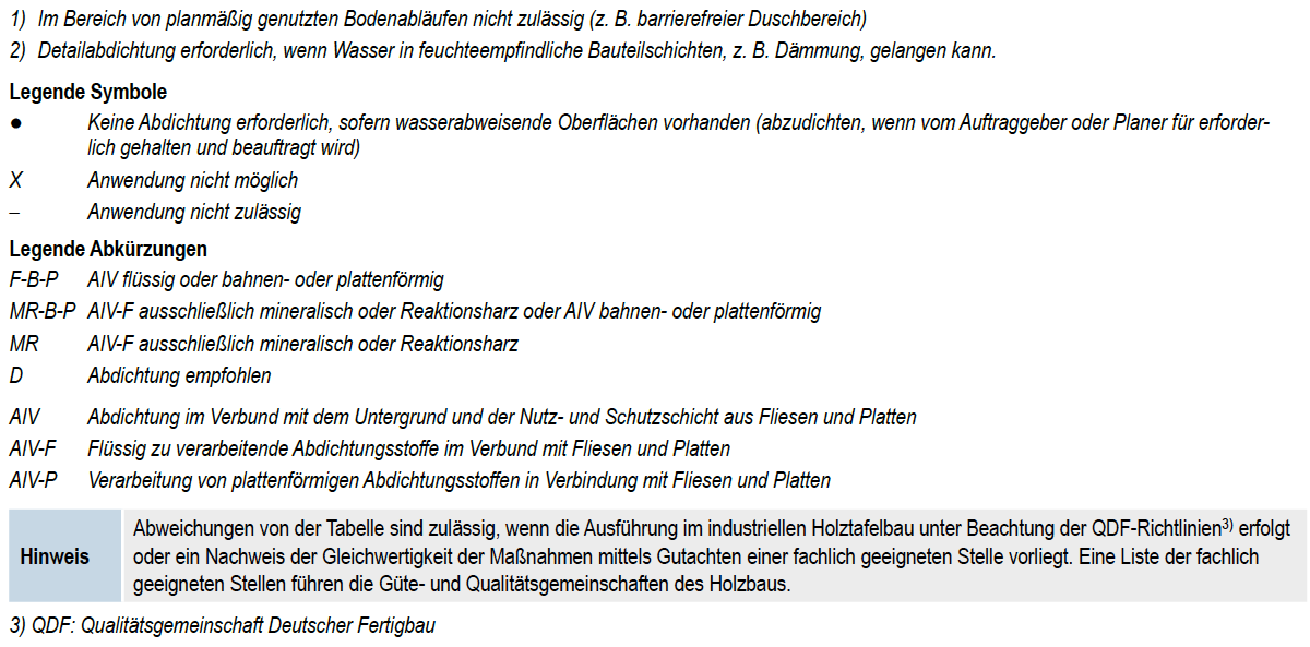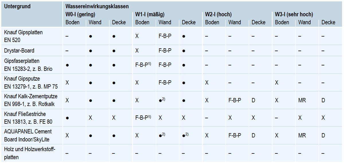 Nach der neuen DIN 18534-1 werden die Untergründe für Wand, Boden und Decke in die Kategorien feuchteempfindliche und feuchteunempfindliche Untergründe unterteilt. Welche Materialien in welche Kategorien gehören, erfahren Sie in folgender Tabelle.