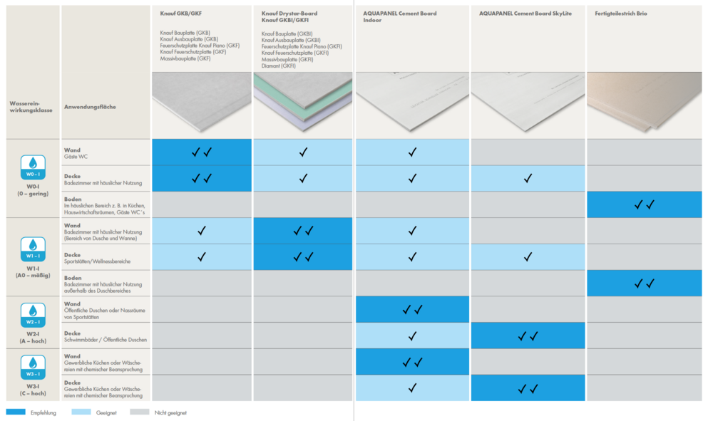Ob Großküche, Wellnessbereich oder Gäste-WC – die Abdichtungsnorm DIN 18534 stellt hohe Anforderungen an den Trockenbau in Feucht- und Nassräumen. Mit Knauf Lösungen erfüllen Sie diese zuverlässig – von W0-I bis W3-I, sogar bis zur Decke. Sicher und geprüft im System.