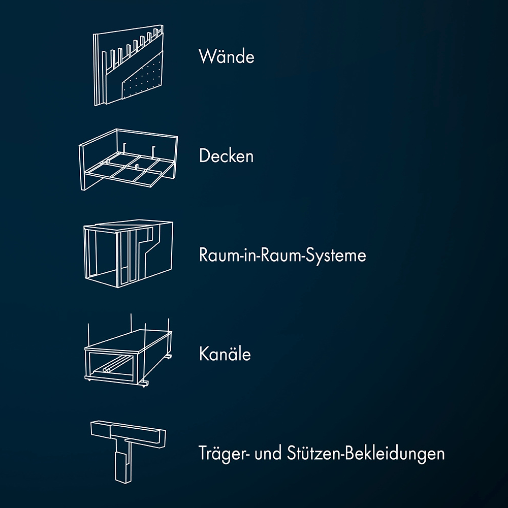 Wände, Decken, Kanäle, Träger- und Stützen-Bekleidungen, Raum-in-Raum-Systeme – wählen Sie Sicherheit.