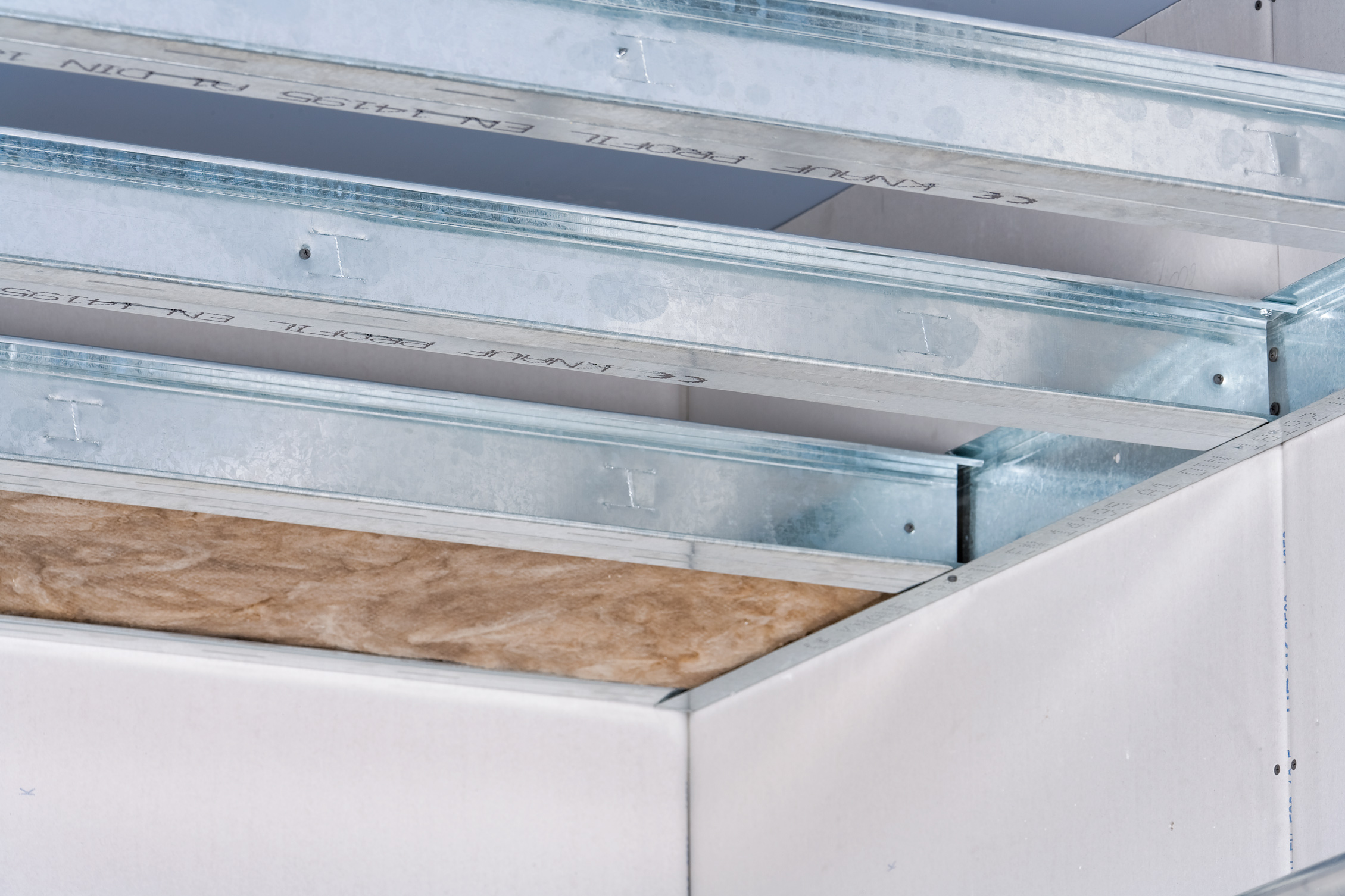 Knauf Platten werden auf eine Metall-Unterkonstruktion aus freitragenden Tragprofilen aus Doppelprofilen CW bzw. UA mit zusätzlichen Abdeckstreifen geschraubt. Die Befestigung der Tragprofile erfolgt ausschließlich an den flankierenden Wänden. Eine oberseitige Abdecklage aus Gipsplatten ist brandschutztechnisch erforderlich. Zwischen den Tragprofilen (auf der Beplankung) wird eine brand- und schallschutztechnisch wirksame Dämmschicht aufgelegt.