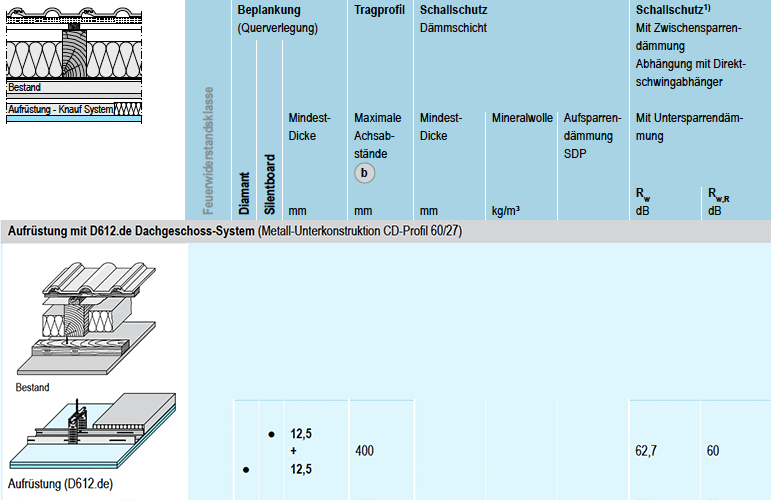 Wir empfehlen Ihnen für die hochwertige Ausführung das Diamant Dachgeschoss-System D612.de – in einer Kombination aus Silentboard und Diamant mit Direktschwingabhänger. Damit bringen Sie die Bestandskonstruktion auf einen guten Schallschutzwert von mindestens Rw 62,7 dB.