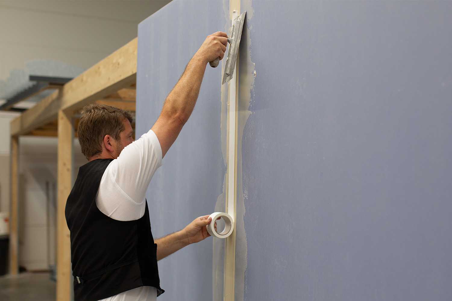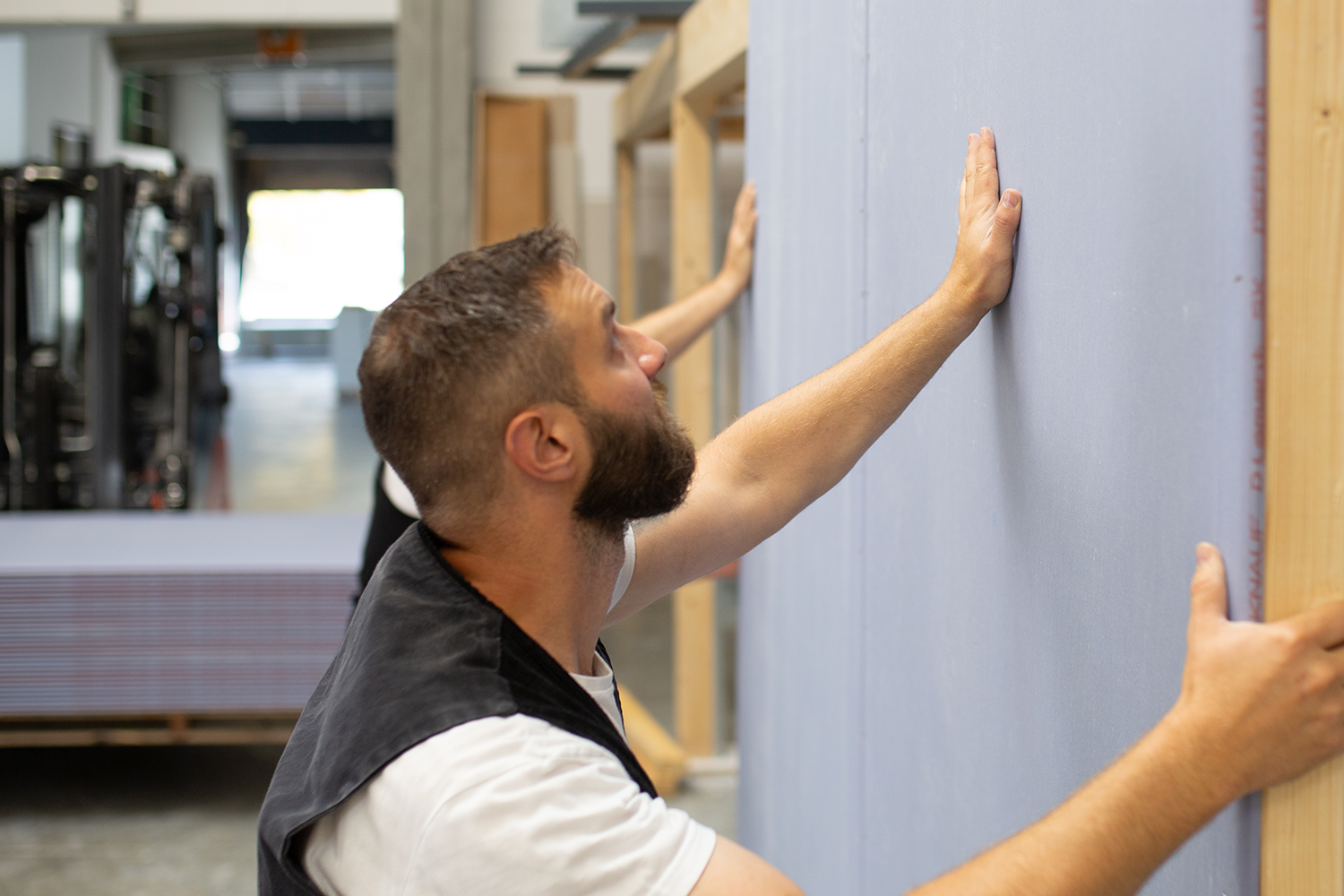 Das einfache Plattenhandling und die Verarbeitungseigenschaften ermöglichen die effiziente Herstellung hochleistungsfähiger, vorgefertigter Holztafelbauwände.