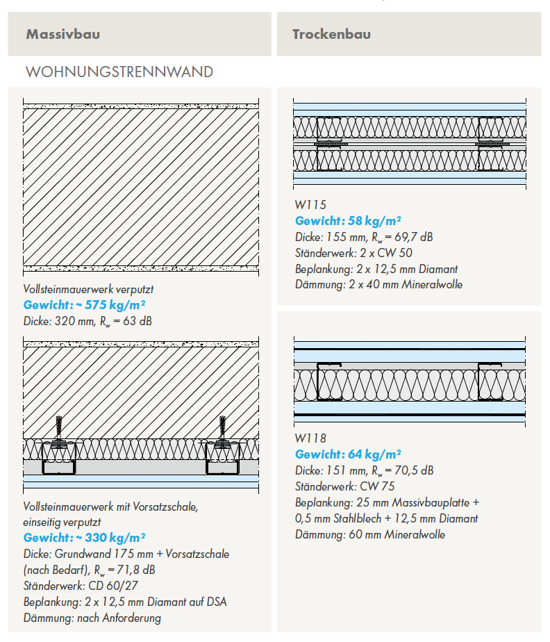 Massivwände sind fast fünfmal so schwer und fast doppelt so dick wie gleichwertige Lösungen im Trockenbau. Der nebenstehende Vergleich zeigt die Gewichtsunterschiede an konkreten Beispielen – für Wohnungstrennwände ebenso wie für Zimmertrennwände.