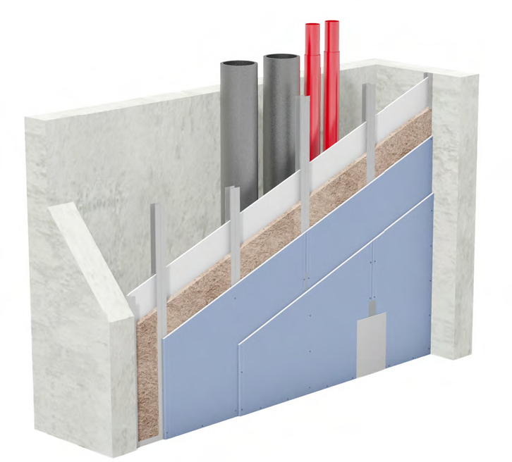2 x 15 mm Diamant als vertikale Beplankung, eine Lage 12,5 mm Feuerschutzplatte Knauf Piano zwischen den Profilen eingestellt und die Hohlräume mit Steinwolldämmung gefüllt – so erstellen Sie Installationsschächte bis 5 m mit Brandschutz F90.