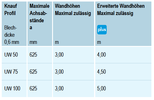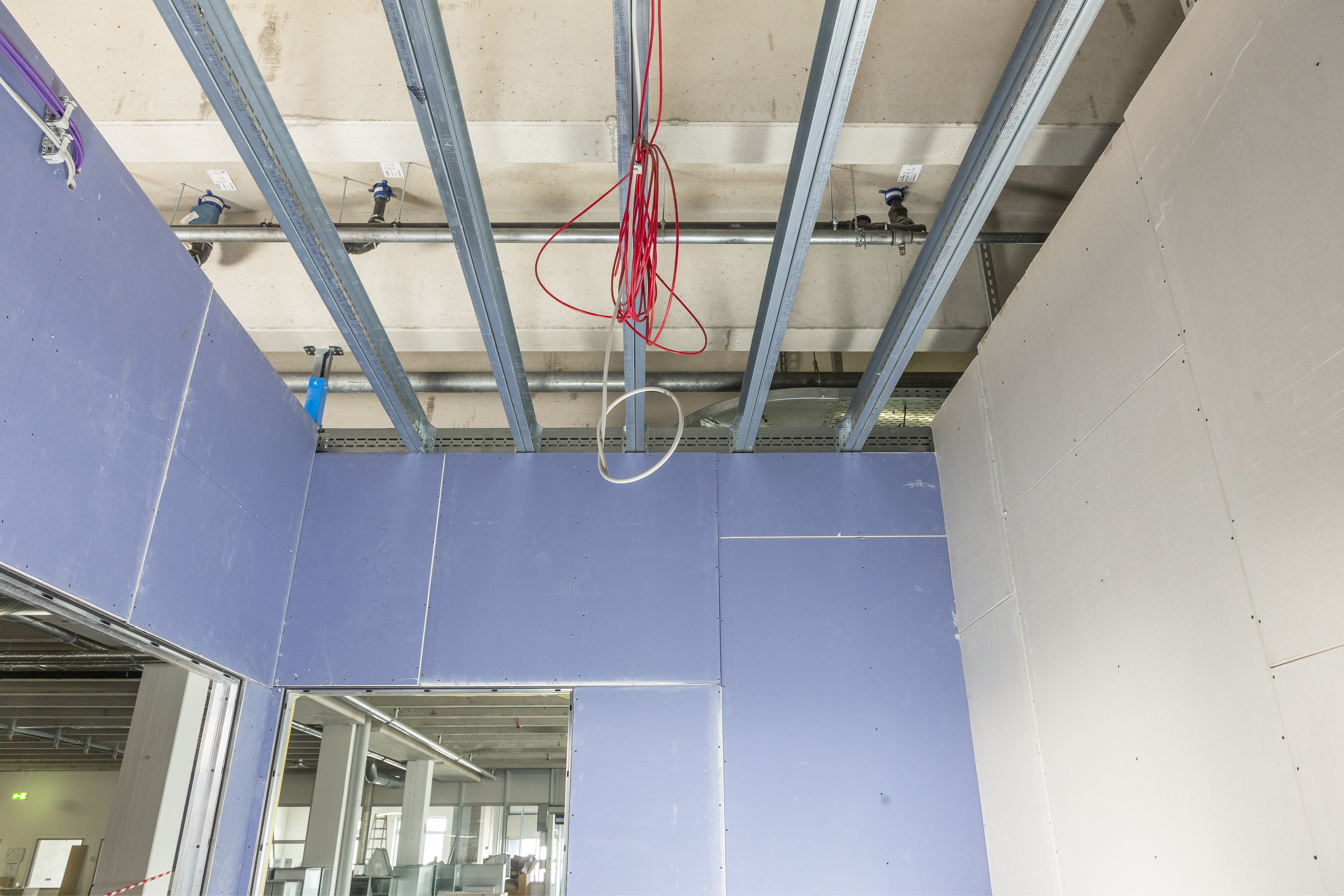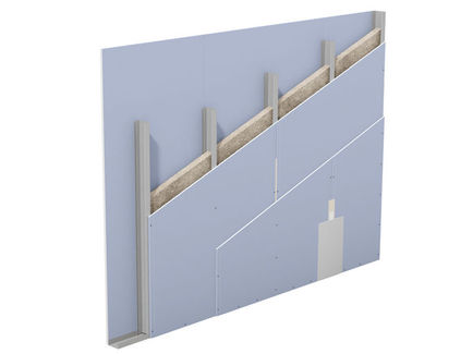 Durch die Mischbeplankung aus Knauf Diamant (64 dB Schallschutz) und AQUAPANEL® Indoor können Sie bis zu 8 m hoch ohne Brandschutz bauen – mit Brandschutz sind 3 m Wandhöhe möglich.