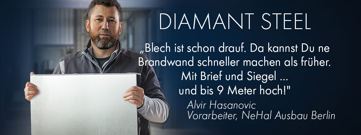 Neben den bewährten Eigenschaften der Diamant bringt die Diamant Steel die Blechkaschierung gleich mit. Das vereinfacht Ihre Baustellen-Logistik.