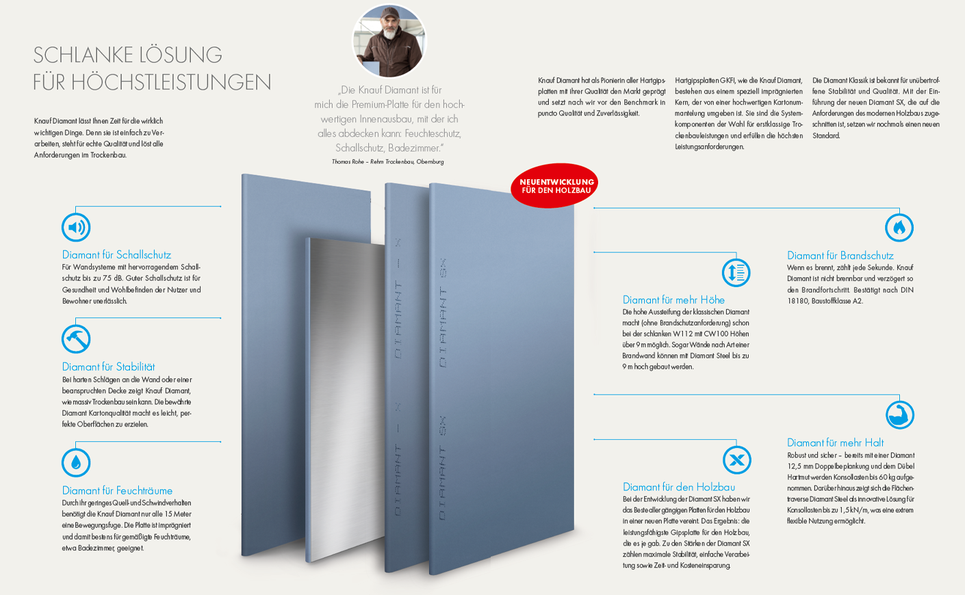Knauf Diamant hat als Pionierin aller Hartgipsplatten mit ihrer Qualität den Markt geprägt und setzt nach wie vor den Benchmark in puncto Qualität und Zuverlässigkeit.