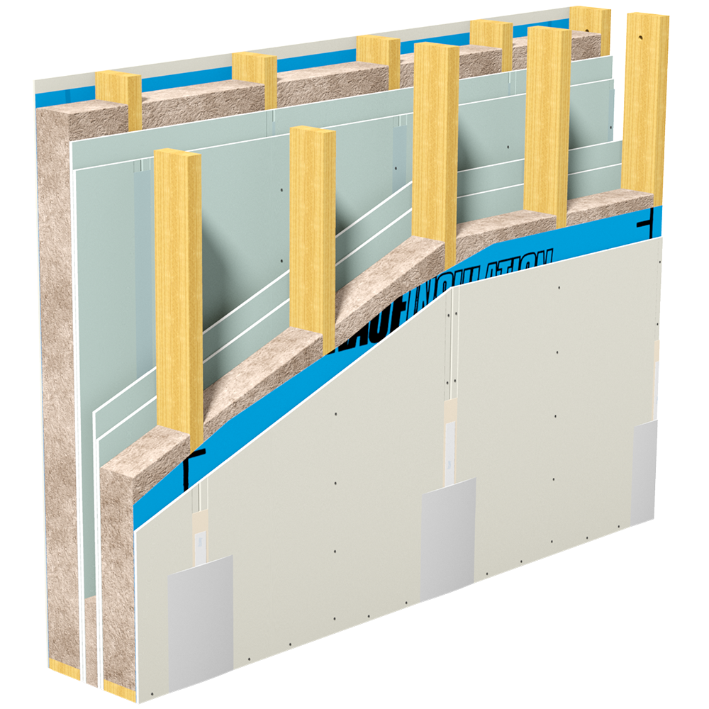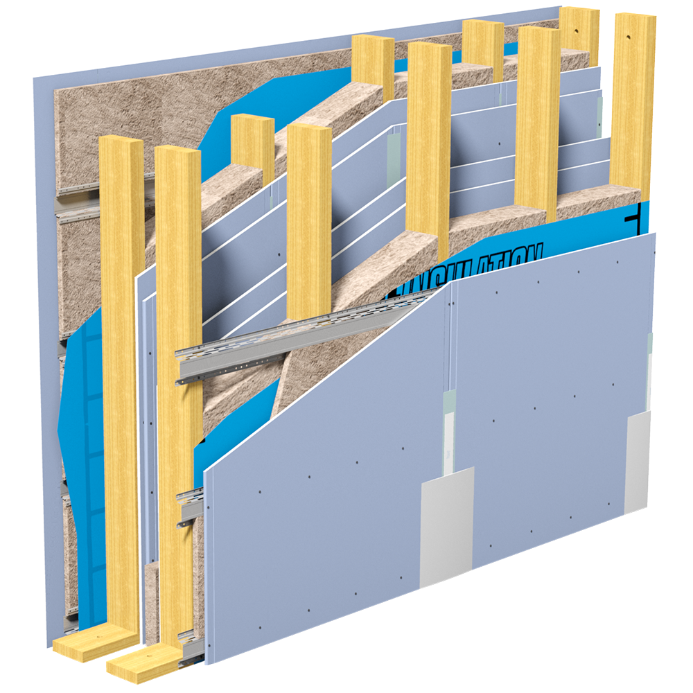 - Innenseitige Beplankung ist durch zusätzliche Unterkonstruktionsebene entkoppelt.