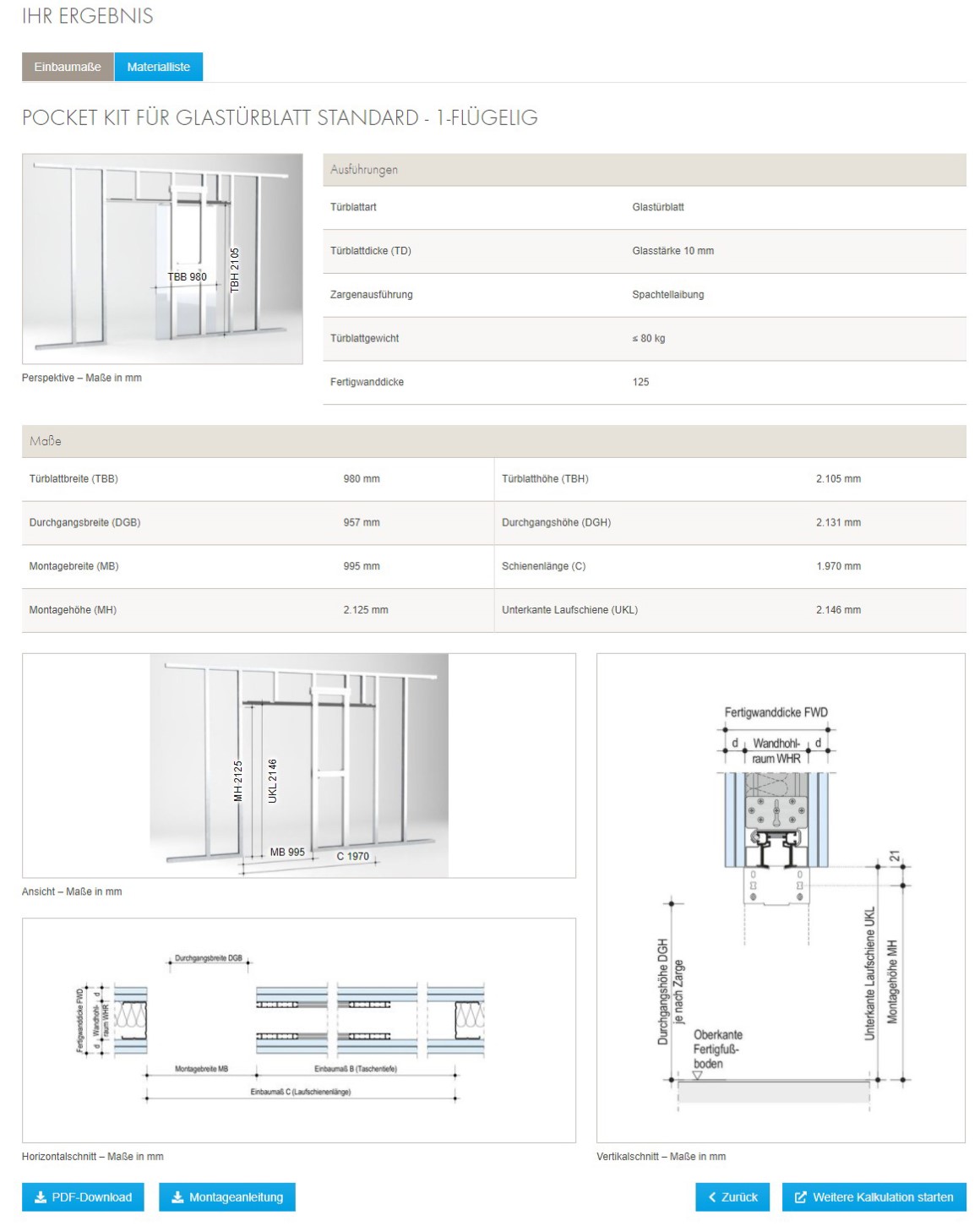 - Die gewünschten Maße, Wanddicke und Türblattgewicht eingeben