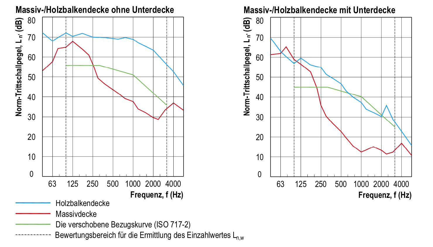Die Anforderungen an den Trittschallschutz bei Holzbalkendecken sind schwieriger zu erfüllen als der geforderte Luftschallschutz gleicher Anforderungskategorie. Sie können davon ausgehen, dass bei ausreichendem Trittschallschutz der Luftschallschutz der Decke in der Regel ebenfalls erreicht wird. Deshalb wird in den meisten Fällen die Decke nach der Anforderung an den Norm-Trittschallpegel im eingebauten Zustand L ́n,w bemessen.