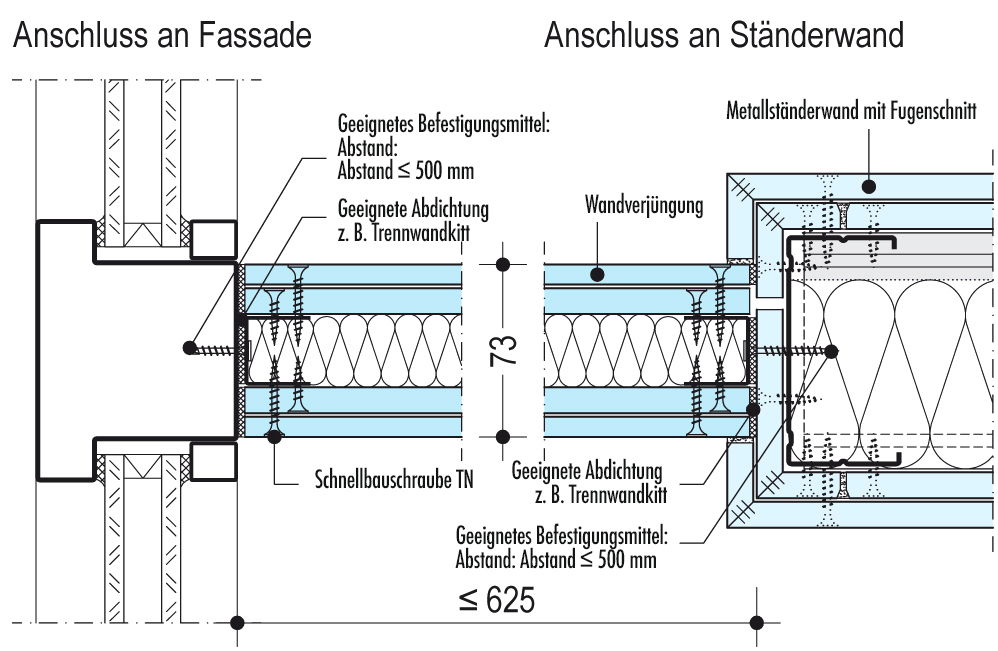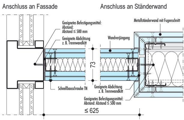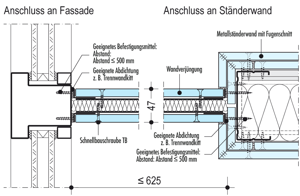 Wenn eine Trockenbauwand zum Beispiel an die schmalen Stege einer Glasfassade angeschlossen werden soll, wird eine Wandverjüngung notwendig.