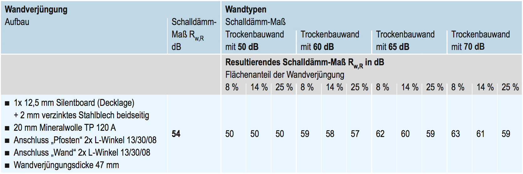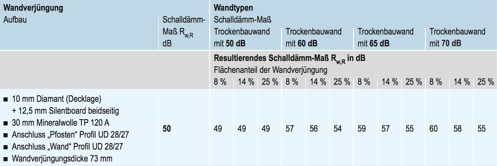 Um auch in diesem Fall einen möglichst guten Schallschutzwert für die gesamte Wand zu erreichen, bieten sich die Schallschutzplatten Diamant und Silentboard an. Gleichzeitig wird mit diesen Konstruktionen auch eine Feuerwiderstandklasse von F30 erreicht.