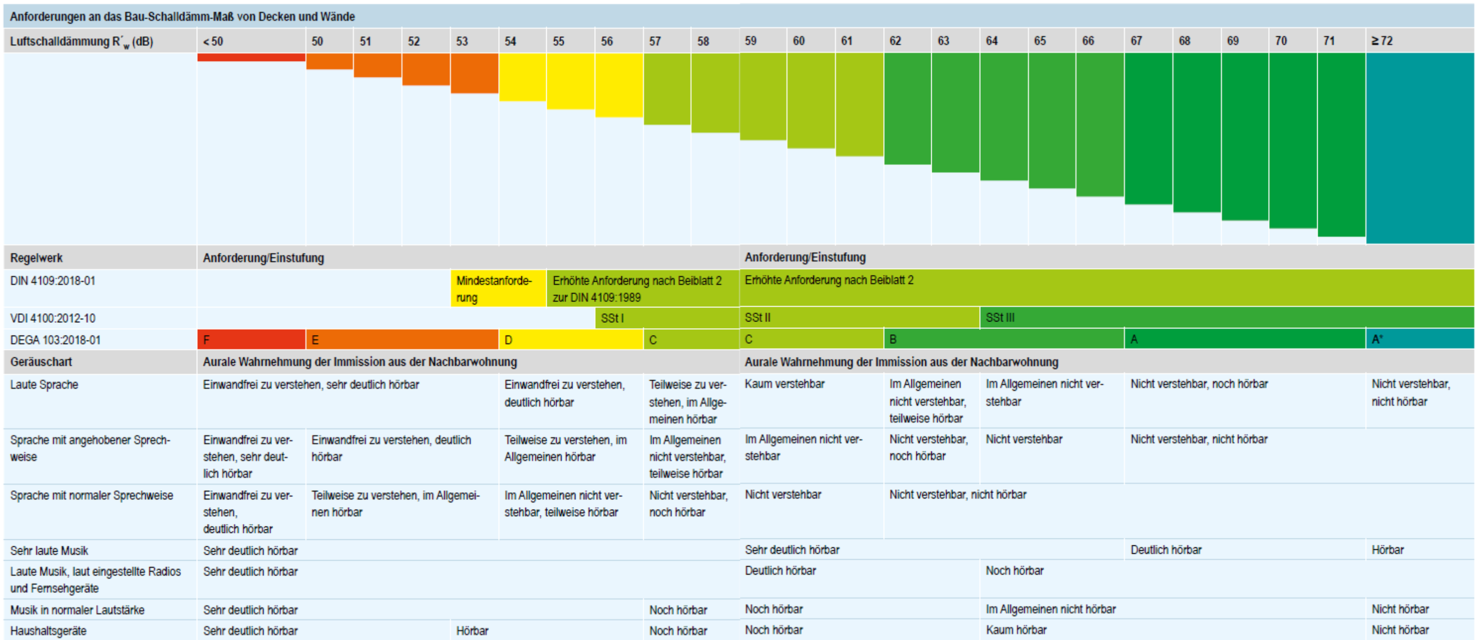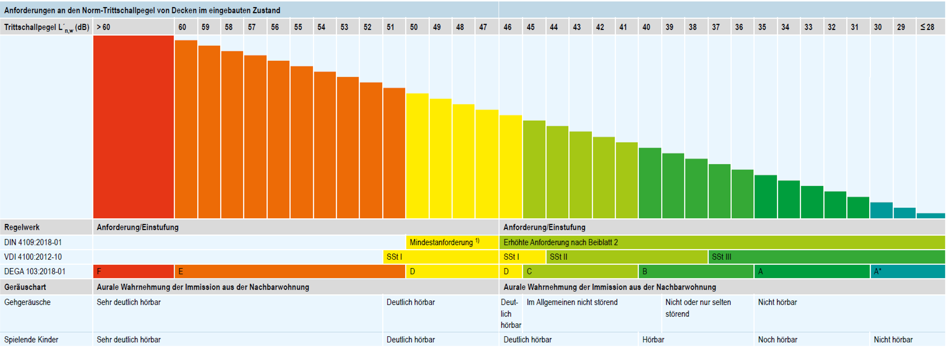 Wichtig: Die Einstufung in einer der sieben Schallschutzklassen der DEGA von A+ bis F ersetzt nicht den geforderten Schallschutznachweis.