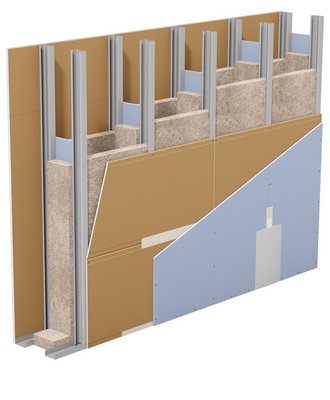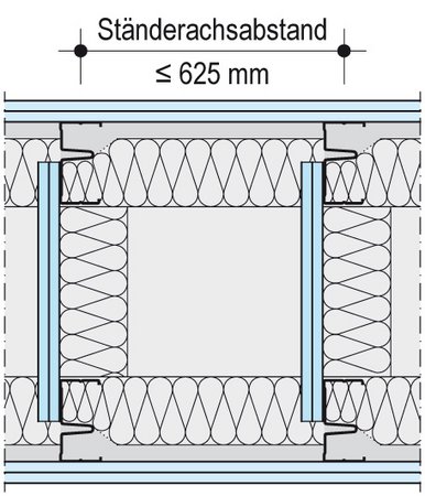 Das DIVA Schallschutzwandsystem W145.de hat ein über die gesamte Höhe mit Plattenstreifen verbundenes Doppelständerwerk und ist mit zwei oder drei Lagen Gipsplatten je Seite beplankt.