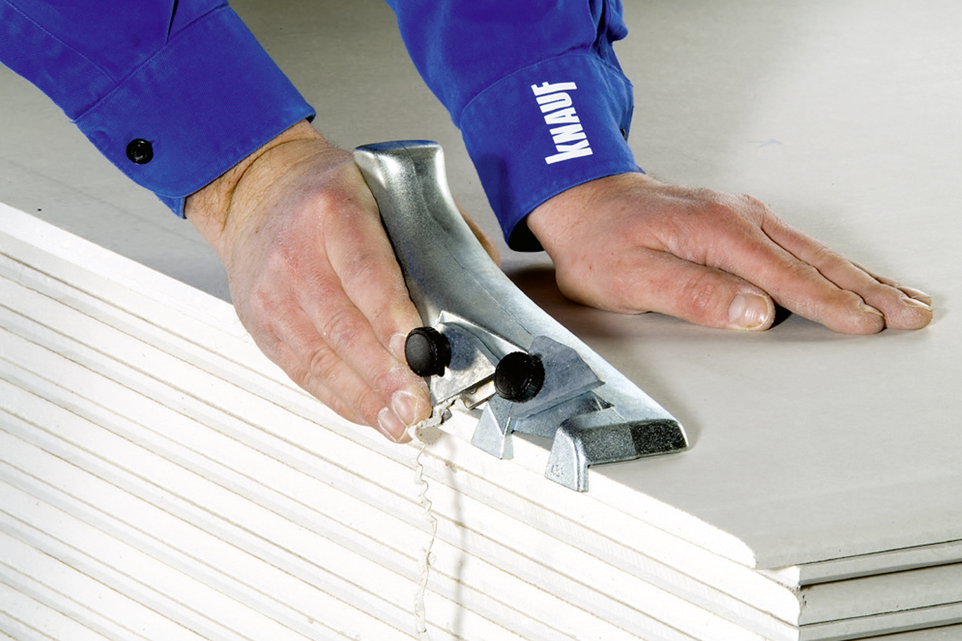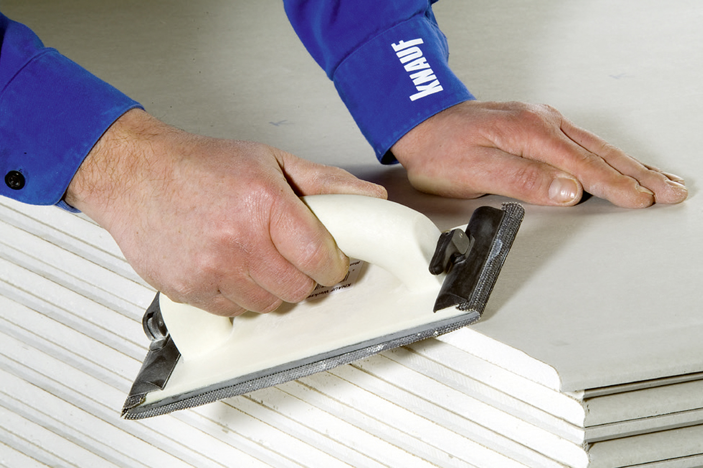 Brechen mit dem Handschleifer der Knauf Cleaneo-Platten
