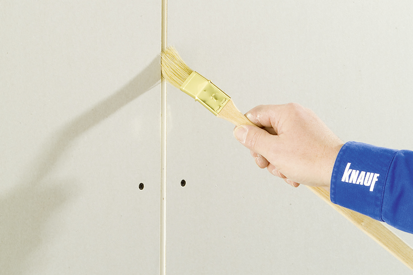 Fuge staubfrei machen. Es empfiehlt sich, unmittelbar vor dem Fugenfüllen den offenen Gipskern zur Staubbindung und Saugfähigkeitsregulierung mit Grundierung (z. B. Knauf Tiefengrund) zu behandeln