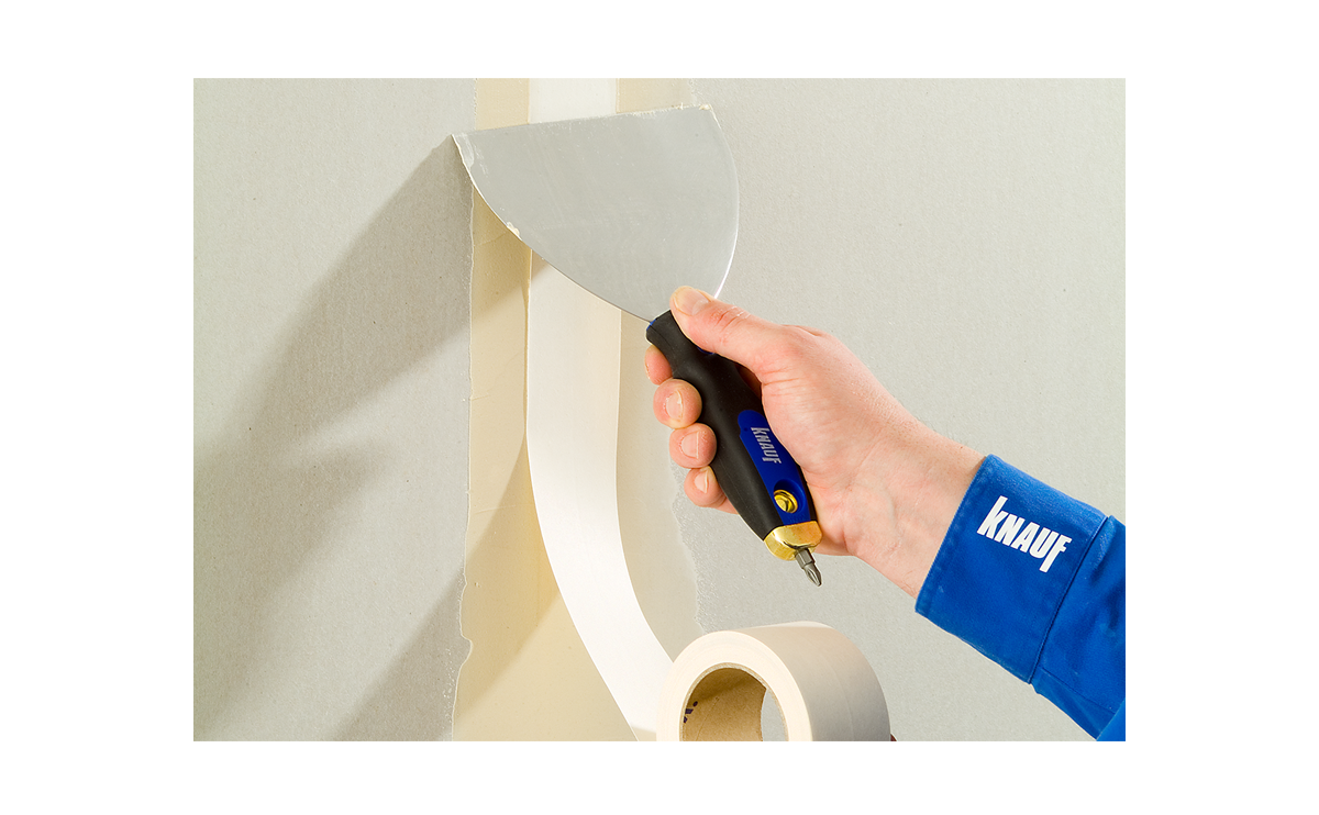 - Kurt mit der Rollen-Außenseite in die Spachtelmasse einlegen. Das außenseitig aufgedruckte Knauf Logo darf nach dem Verarbeiten nicht mehr sichtbar sein.