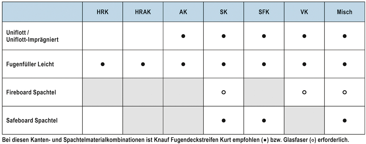 Um Risse zu vermeiden sorgt der Einsatz eines Fugendeckstreifens zur Verstärkung der Spachtelfuge für Sicherheit. Es gibt vier verschiedene Typen, die sich in ihrem Material und den mechanischen Eigenschaften unterscheiden: den bewährten Knauf Fugendeckstreifen Kurt, Glasfaser-Streifen, klassische Papierfugendeckstreifen und Gitterstreifen. Technisch zu empfehlen und von der Trockenbaunorm vorgesehen sind Papierstreifen wie z.B. Knauf Kurt Fugendeckstreifen.