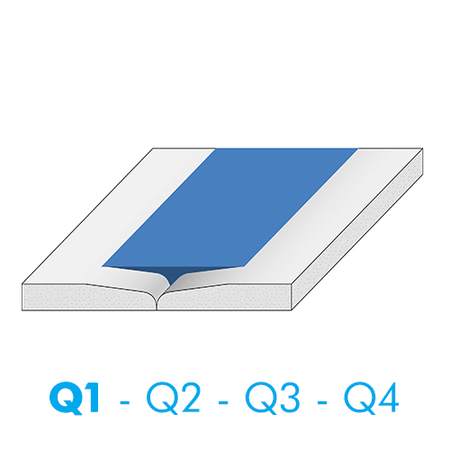 Die Verspachtelung nach Q2 umfasst die Grundverpachtelung (Q1) sowie das Nachspachteln (Feinspachteln bzw. Finish), bis ein stufenloser Übergang zur Plattenoberfläche erreicht ist. Es dürfen keine Bearbeitungsabdrücke oder Spachtelgrate sichtbar bleiben. Ansonsten sind die betroffenen Bereiche zu schleifen.