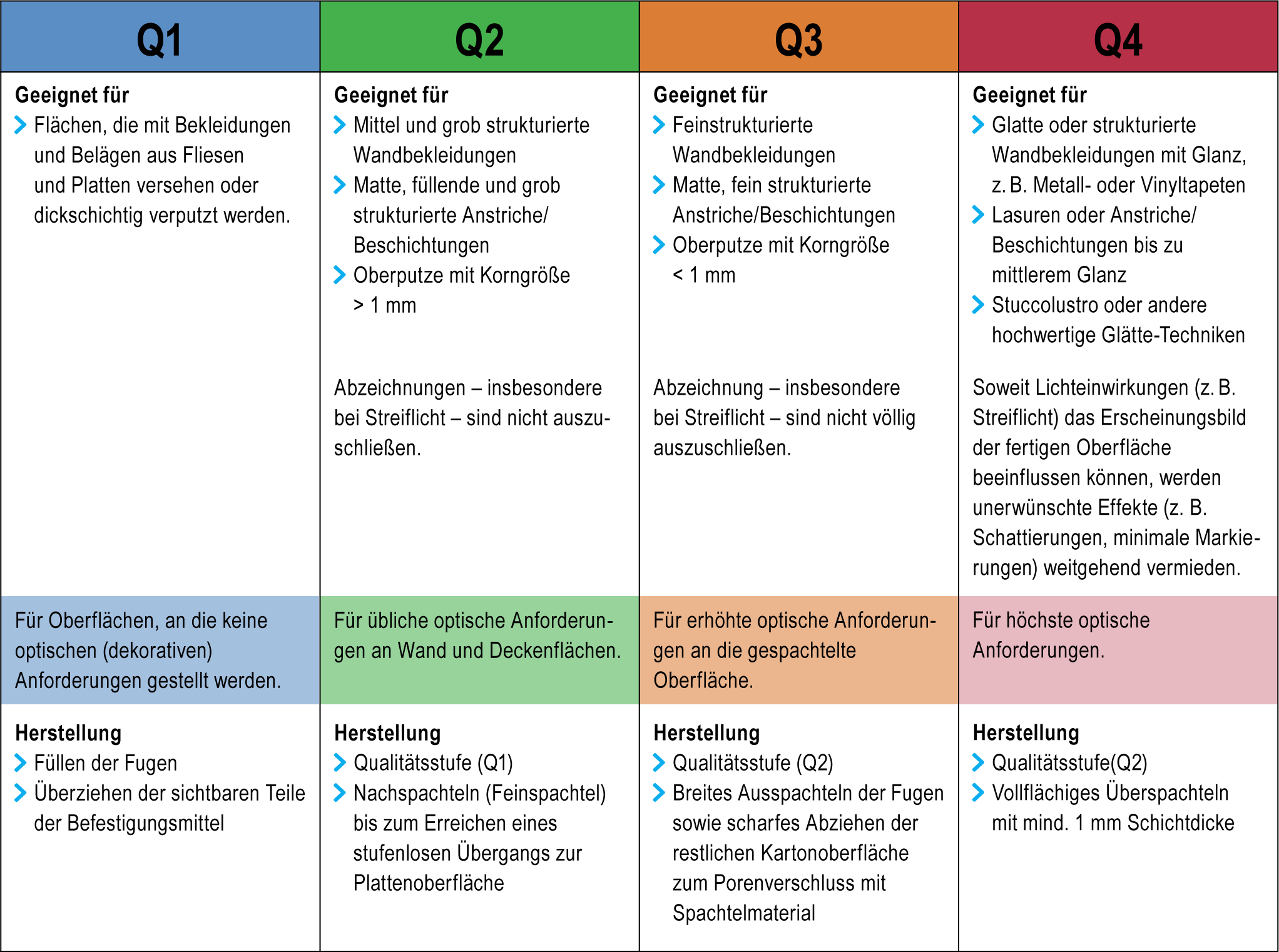 Die auf diese Weise hergestellte Oberfläche ist geeignet für mittel- und grobstrukturierte Wandbekleidungen (z. B. Raufasertapeten), matte, füllende und grob strukturierte Anstriche und Oberputze mit einer Körnung > 1 mm. Doch Vorsicht: Bei Q2 als Grundlage für Wandbekleidungen und Anstriche können bei Einwirkung von Streiflicht Fugenabzeichnungen nicht ausgeschlossen werden.