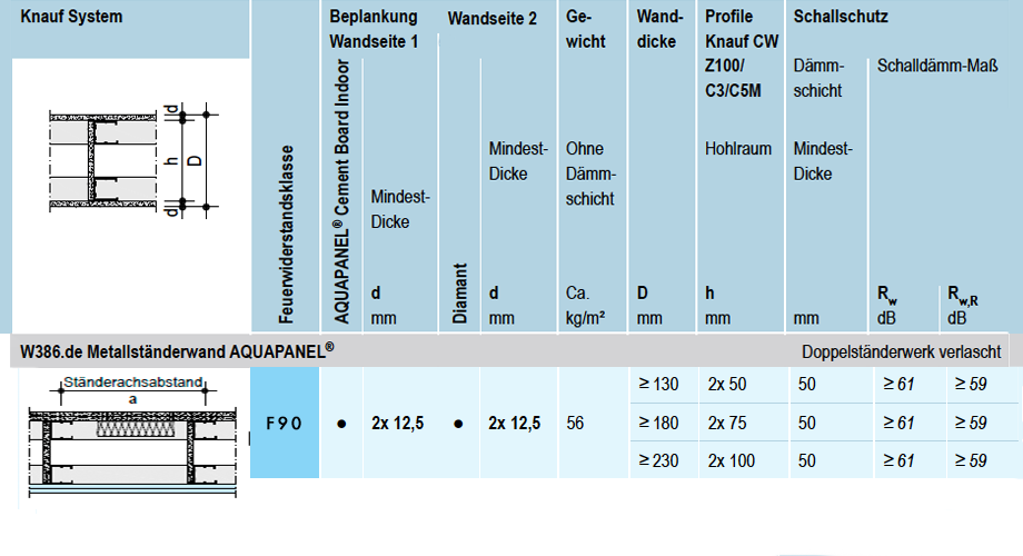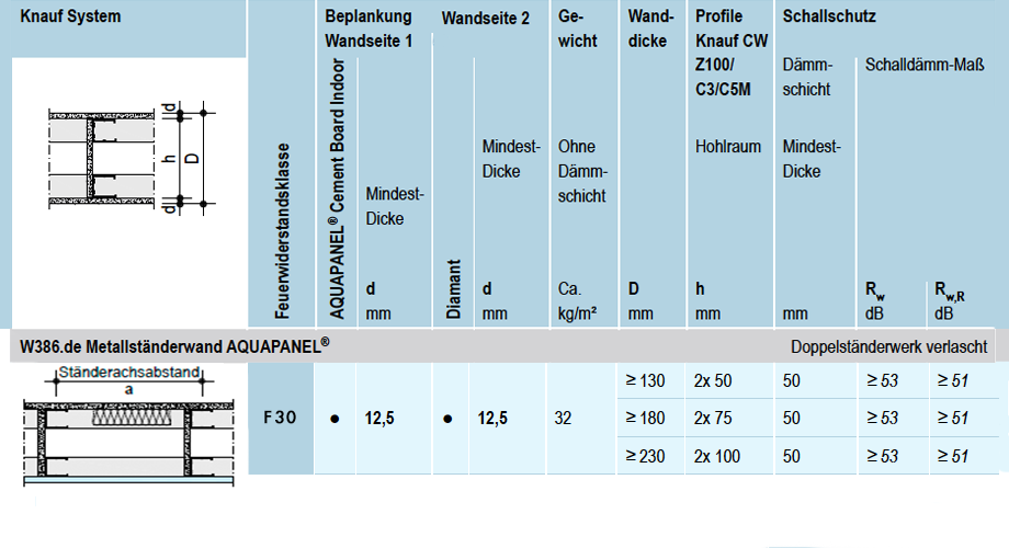 Installationen brauchen ausreichend Platz. Das auf Abstand ausgebildete Doppelständerwerk W386.de können Sie auf der einen Wandseite mit Diamant und auf der anderen Seite mit AQUAPANEL® Cement Board Indoor beplanken. Durch die Mischbeplankung aus Knauf Diamant und AQUAPANEL® Indoor (59 dB Schallschutz) können Sie ohne Brandschutz bis zu 8 m hoch bauen – mit Brandschutz sind 3 m Wandhöhe möglich.