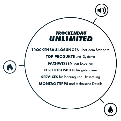 Wenn Standard nicht genug ist, vertrauen Profis auf die Lösungen von Knauf Trockenbau Unlimited. Finden Sie hier die Produkte und Systeme für leistungsfähigen Brandschutz, Schallschutz und Akustik oder Feucht- und Nassräume.